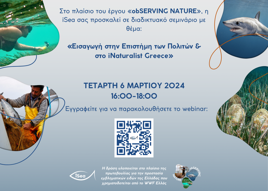 Στο πλαίσιο του προγράμματος obSERVING NATURE, η iSea σας προσκαλεί στο διαδικτυακό σεμινάριο με θέμα: «Εισαγωγή στην Επιστήμη των Πολιτών & στο iNaturalist GR».